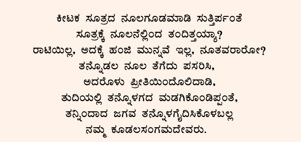 Spiritual Context : Basavanna’s vision transforms the way one perceives the world. The awakened one does not withdraw from the world; they participate in it consciously, seeing every act as part of the Divine play.