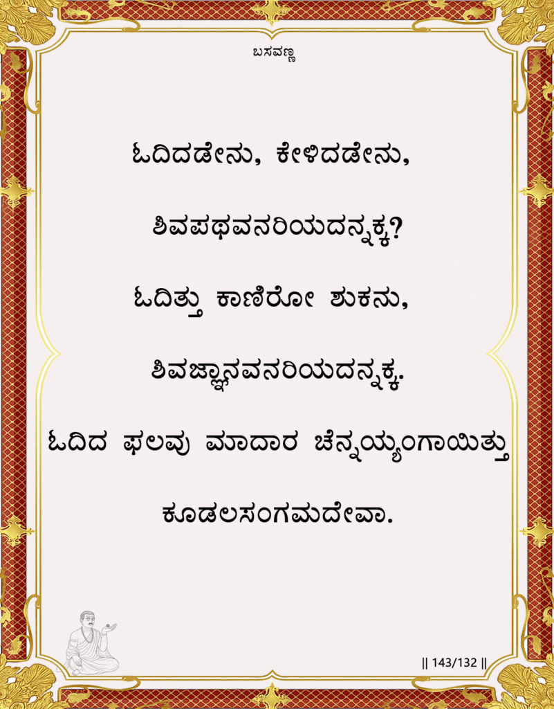Basavanna contrasts mere scriptural study with direct inner realization. Even the exalted sage Shuka gained nothing from learning when it lacked inner devotion and lived experience. But Chennayya, a humble cobbler, found true spiritual fulfillment because he turned knowledge into inner awakening. The Vachana teaches that spiritual worth is not measured by caste, profession, or scholarship, but by one’s capacity to internalize and live the truth of the Divine.