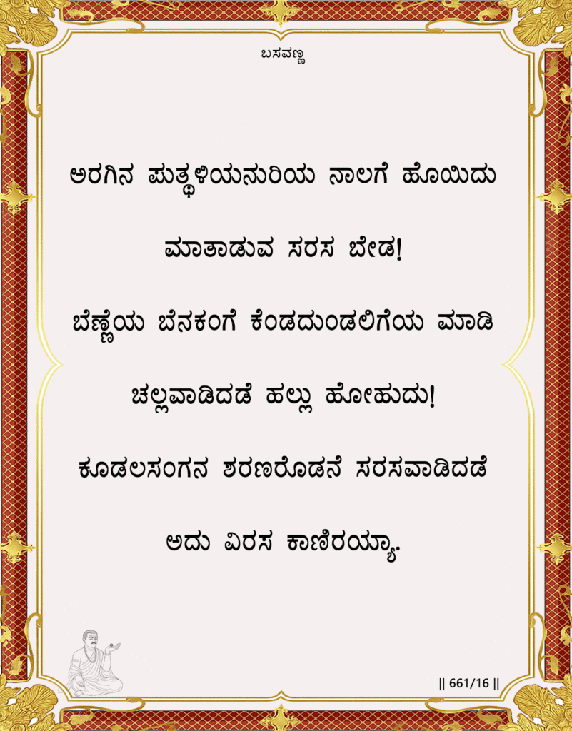 Basavanna here evokes a striking image a butter idol set near a flame, destined to melt away. Just as such an idol cannot endure heat, the human body too is fragile and fleeting. Within this temporary vessel reside instruments of speech the tongue, teeth, and smile meant for the praise of the divine, not for idle talk or mockery among the saints. He warns that to use these perishable tools for frivolous laughter in sacred company is to forget the gravity of human existence. Awareness (Ariwu) of impermanence (mrityu-jñāna) is the foundation of true reverence. Basavanna calls the seeker to a higher mindfulness: to let speech become prayer, thought become humility, and silence itself become an act of devotion.