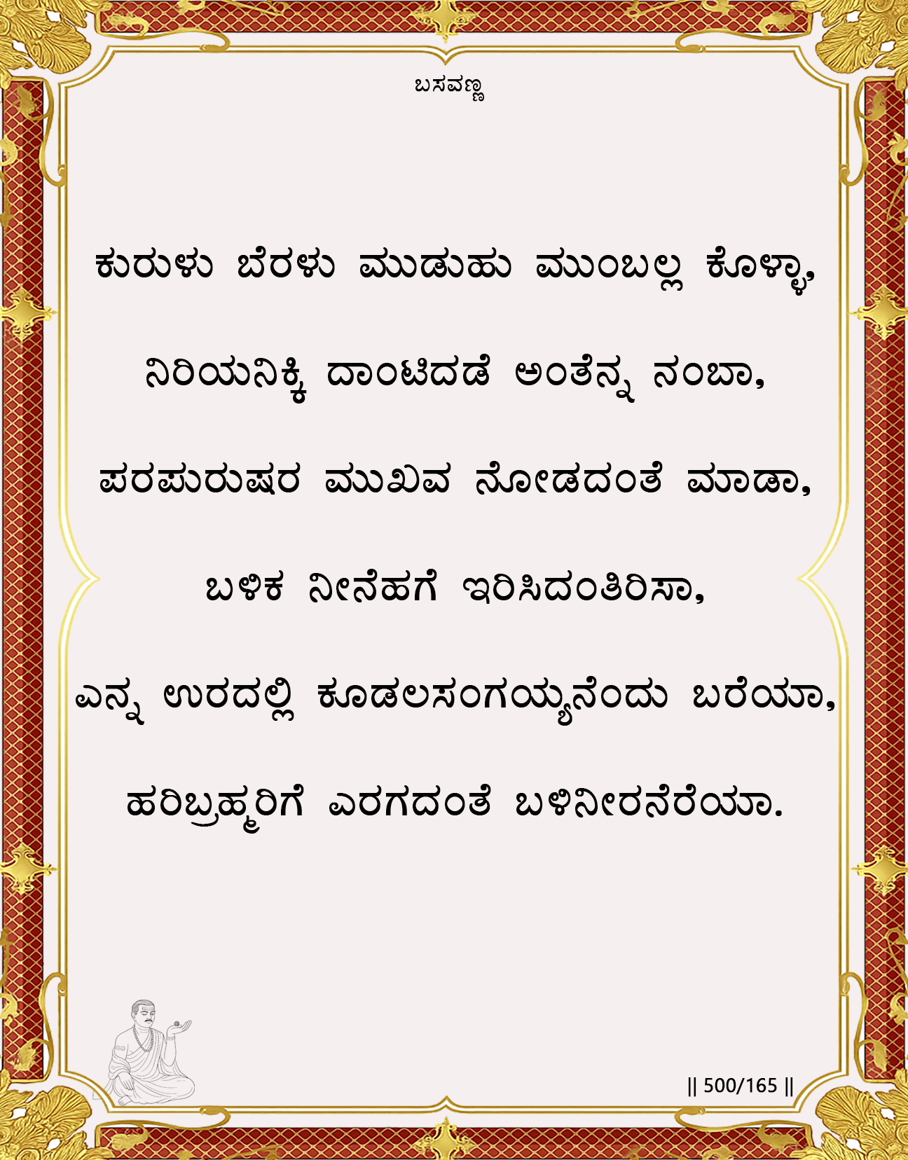 This vachana teaches that external purification ritualssuch as bathing in sacred waterscannot guarantee true spiritual transformation. Real sanctity arises when the seeker abandons duality and stops searching for divinity outside themselves. Basavanna prays for an inner “branding,” a deep and irreversible imprint of Koodalasangamadeva within the heart, so that no other belief, deity, or illusion can sway the devotee. True liberation is not achieved through outward acts, but through unwavering inner union with the Divine.