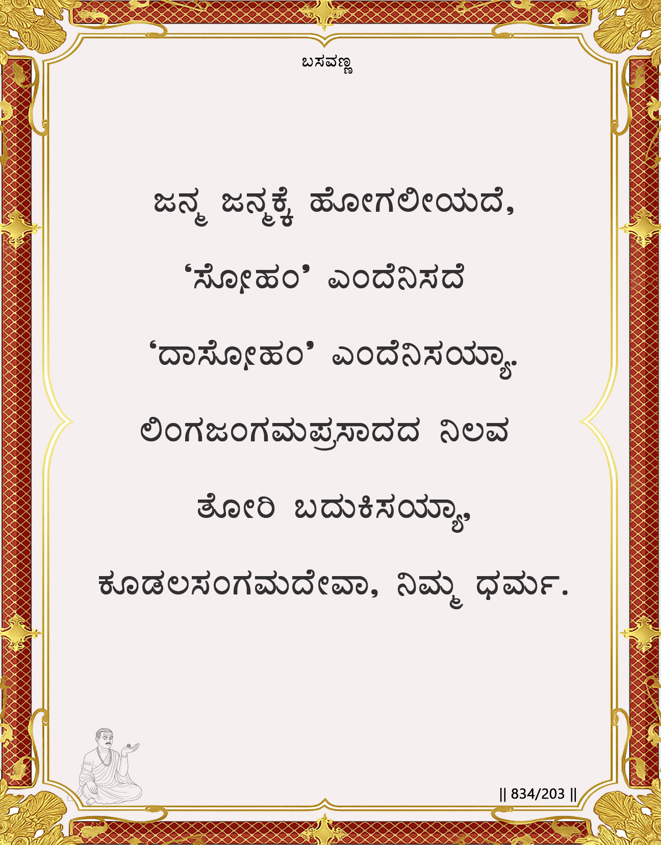 Basavanna prays that across lifetimes he may not lose the rare human birth the only state where one can cross from form into the formless and realize the divine. Begging not to be turned away from this opportunity, he also asks to be protected from the subtle spiritual arrogance that declares “I am That.” True realization, he teaches, is grounded in humility and devotion, expressed through the attitude “I am Yours.” By the sustaining grace of Linga and Jangama, the seeker’s ego dissolves, and the path to union with Kudalasangama remains pure and open.