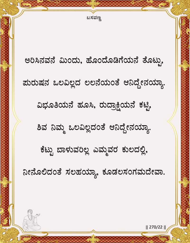 The poet compares a wife adorned in silk and jewels but lacking her husband’s love to a devotee who wears the external marks of piety (ash, rudraksha) but lacks the inner grace of the Lord. Both lives are hollow. He prays that in his lineage, such falsehood finds no place, and asks Kudalasangama for the grace of a life where truth is lived in love.