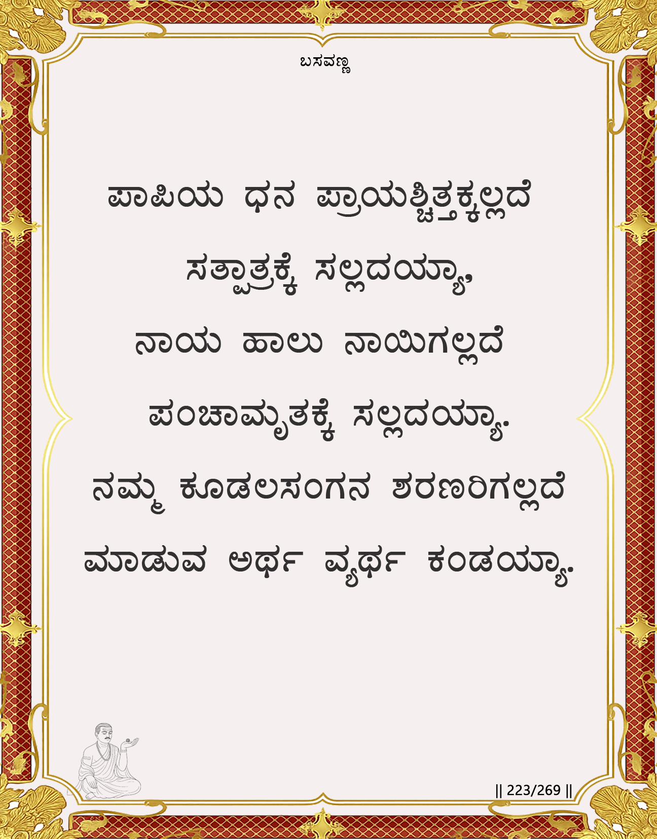 Basavanna issues a powerful warning against using charity to mask wrongdoing. No ritual or donation can purify wealth gained through cruelty, deceit, or exploitation. True sanctity lies not in the amount given but in the purity of its source and intention. Wealth earned through Kayaka (honest labor) and shared through Dasoha (selfless giving) is blessed, while wealth born of manipulation or suffering becomes spiritual poison. Basavanna exposes the danger of turning religion into a marketplace and reminds us that the Divine cannot be bribed.