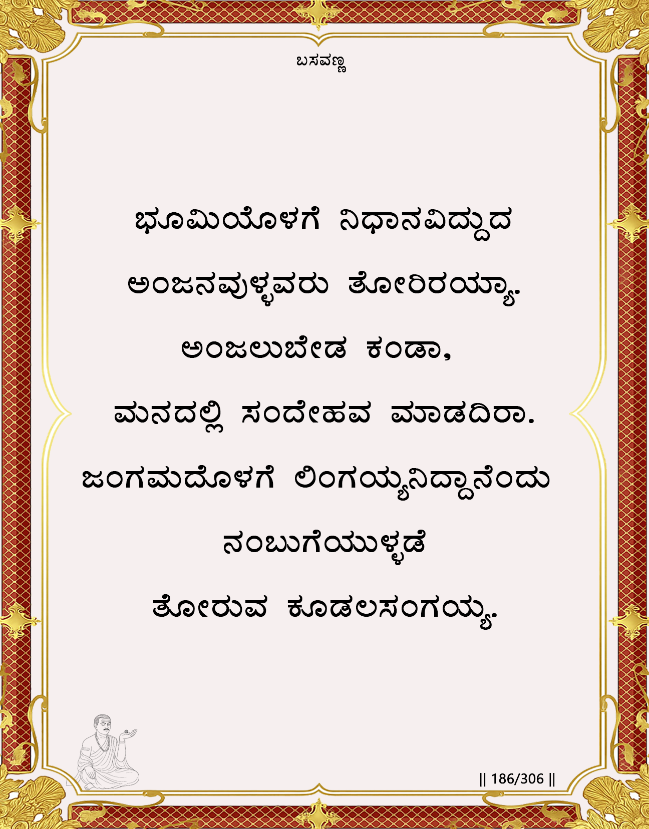 Basavanna urges the seeker to continue the sacred discipline of holding the Linga in the palm and offering worship with sinceritya practice akin to “trataka” in Lingayoga. Just as a miner reveals what lies concealed beneath the earth, the Divine hidden within the living Jangama who bears the same Lingawill gradually become visible to the seeker. The unmanifest begins to manifest through the living sages because they are the true companions of Kudalasangamadeva. Steadfastness, inner clarity, and devotion open the inner sight that perceives the Divine in its living form.