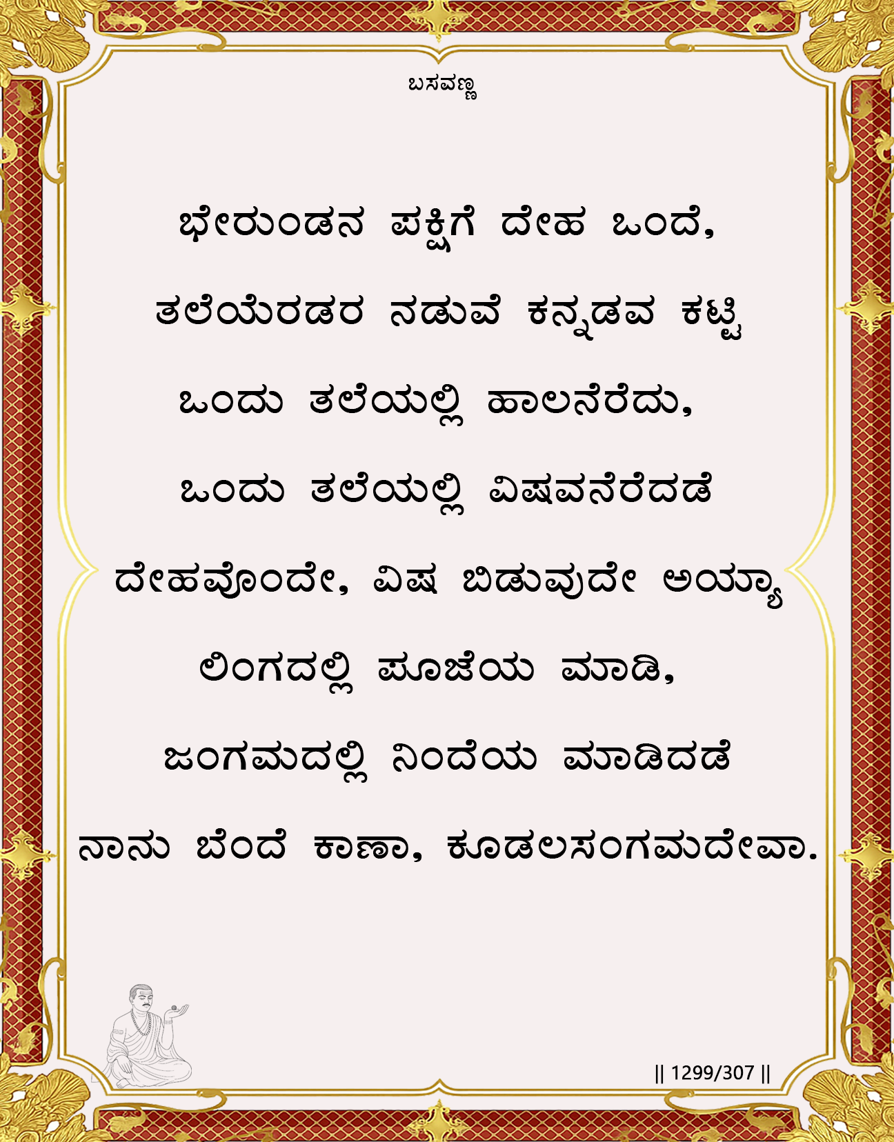 The Destruction Born of Divided Devotion In this vachana, Basavanna unfolds one of his most striking metaphorsthe Bherunda, a mythical two-headed birdto expose the inner contradiction of divided devotion. Though the bird has two heads, it shares one body; what harms one ultimately harms both. This serves as a vivid mirror to the seeker’s inner life. Basavanna warns against a spiritual split: revering the Linga (the transcendent Divine) while dishonoring the Jangama (the living embodiment of that same Divine). Such a contradiction is not merely a moral failingit is a form of spiritual self-harm. Just as poison given to one head destroys the entire bird, disrespect toward the Jangama nullifies one’s worship of the Linga. This vachana thus functions as both critique and caution. It exposes the human tendency to compartmentalize spirituality honoring the sacred in ritual while wounding it in life. Basavanna teaches that true devotion is indivisible: