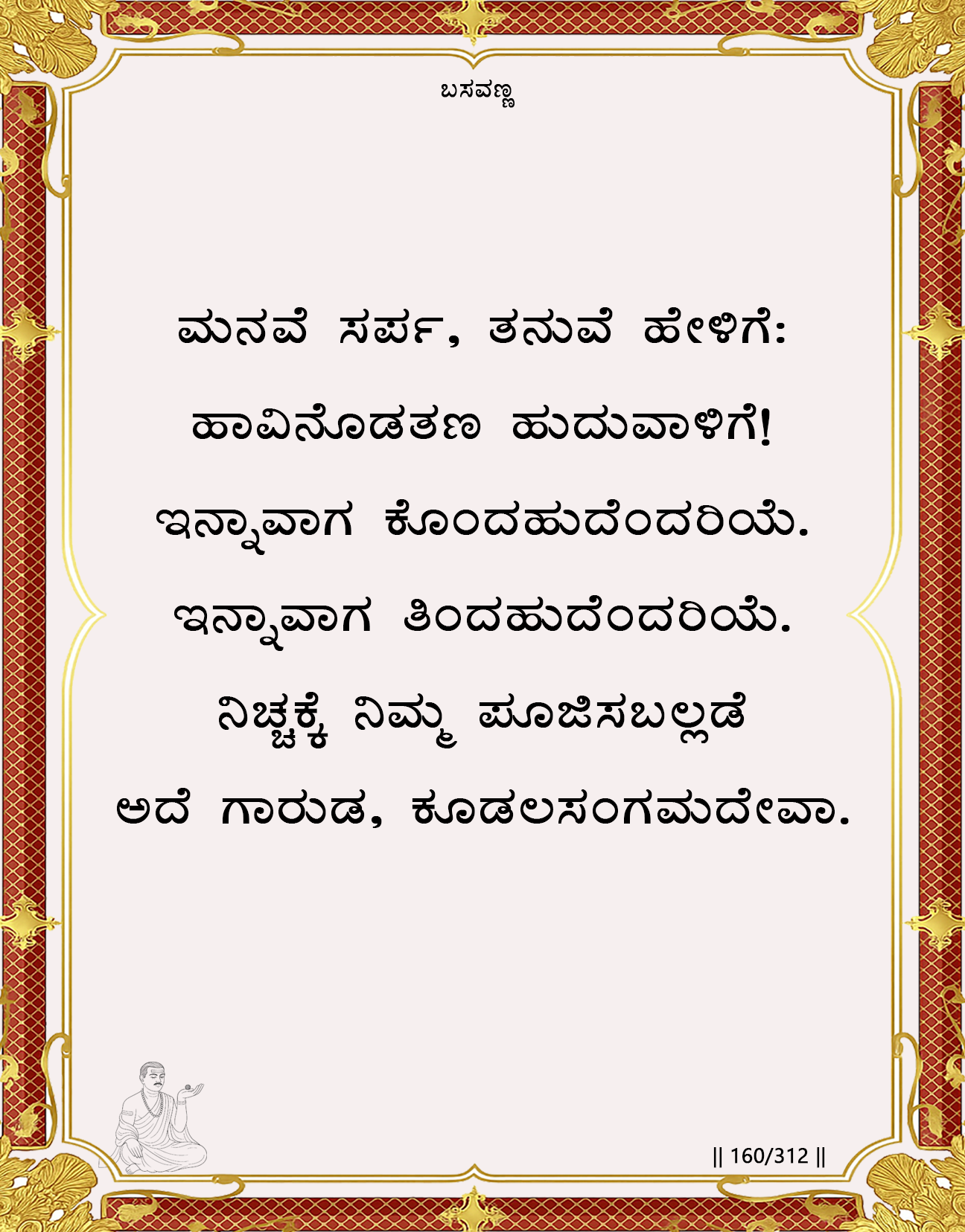 In this vachana, Basavanna gives one of his most striking psychological and yogic teachings. He compares the mind to a serpent unpredictable, subtle, and potentially dangerous. The body is its container. One cannot control when the serpent-mind will strike with anger, desire, fear, or delusion. Therefore, the path is not to suppress or fear it, but to cultivate constant awareness the spiritual vigilance that keeps the serpent from turning destructive. This vigilant awareness is symbolized by the eagle (Garuda), the natural adversary and conqueror of serpents. For Basavanna, this vigilance is unbroken remembrance of the Divine, a steady inner gaze toward the Linga, a continuous offering of awareness. When consciousness remains anchored in Kudalasangama, the serpent-mind loses its venom and becomes harmless. It is not destroyed, but transmuted. Thus, Basavanna teaches that liberation is achieved not by escaping the mind, but by illuminating it through unwavering devotional awareness.