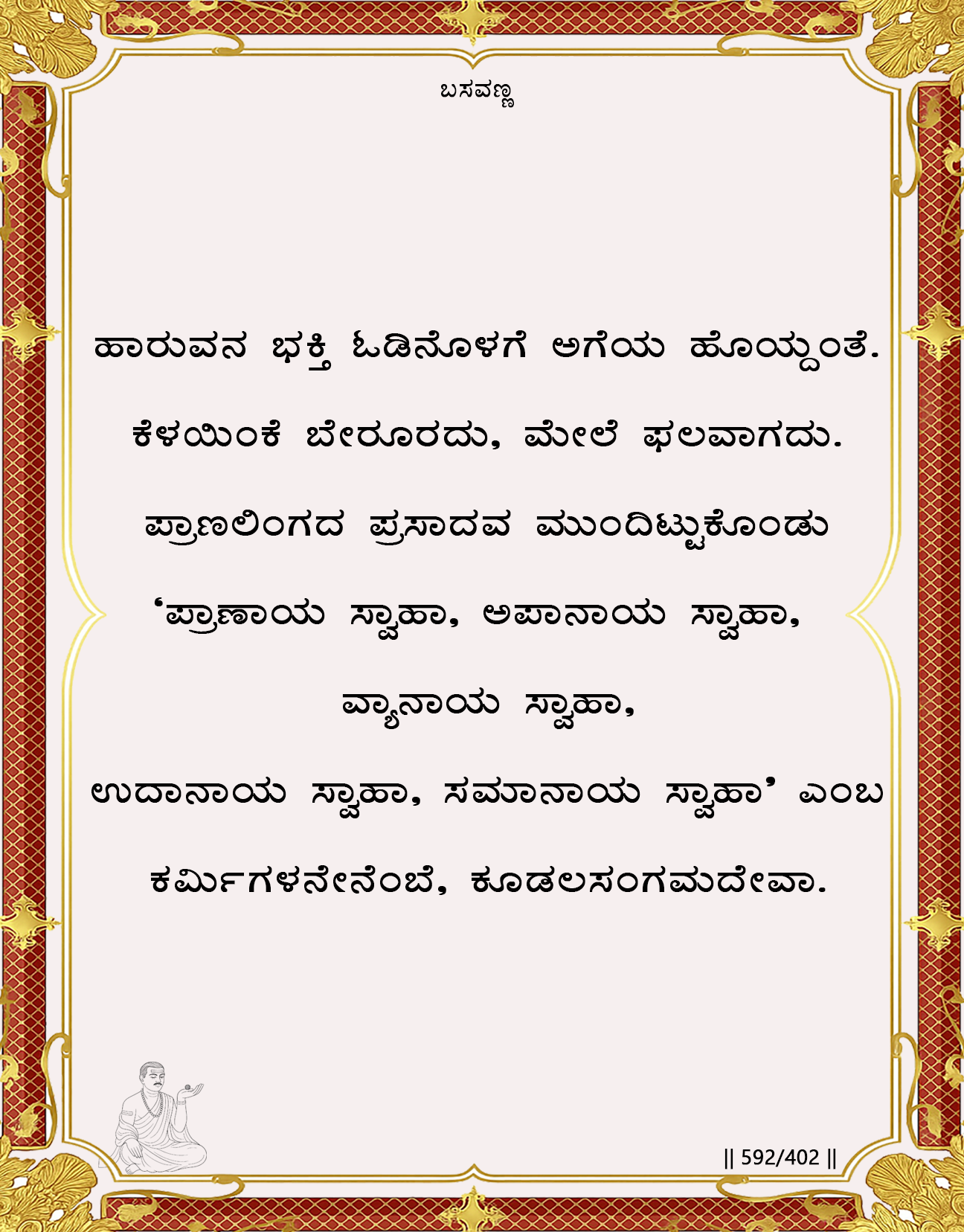 the Divine present as life-force, breath, awareness— exists inside the living body. It is immediate, experiential, and self-revealing. To miss this living presence while performing external rites is to mistake the shell for the substance. The Futility of Mechanical Mantras Basavanna lists the traditional Vedic utterances associated with the five prānas and their ritual offerings:
