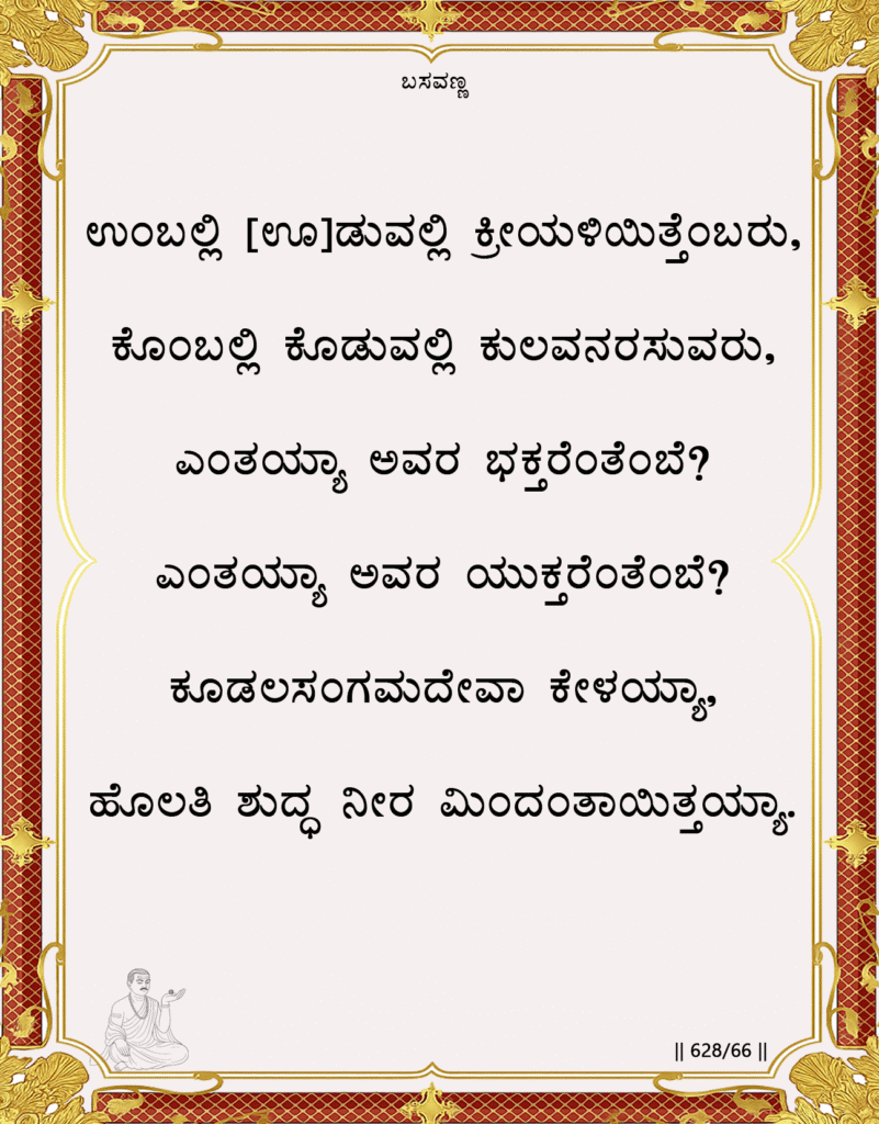 Basavanna criticizes those who claim that dining with people of different castes corrupts one’s faith. He rejects such narrow mindedness, questioning whether those who hold such views can truly be called devotees or wise ones. Judging inclusivity as impurity, he says, is like contaminating pure water through one’s own misunderstanding.