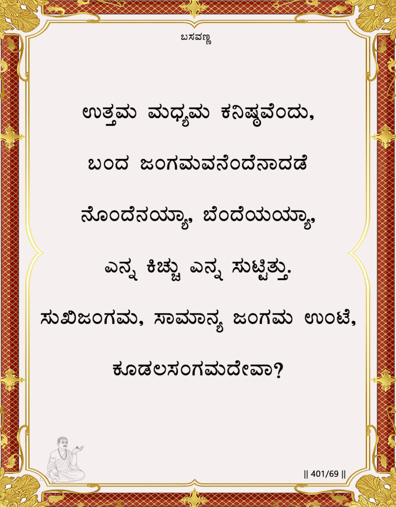 1. “When they declare ‘This jangama is superior, that one mediocre, this one inferior’ ” Basavanna begins by naming the blasphemy. The act of “declaring” or labeling is the ego’s attempt to control and categorize the infinite, which is an act of violence against the sacred.