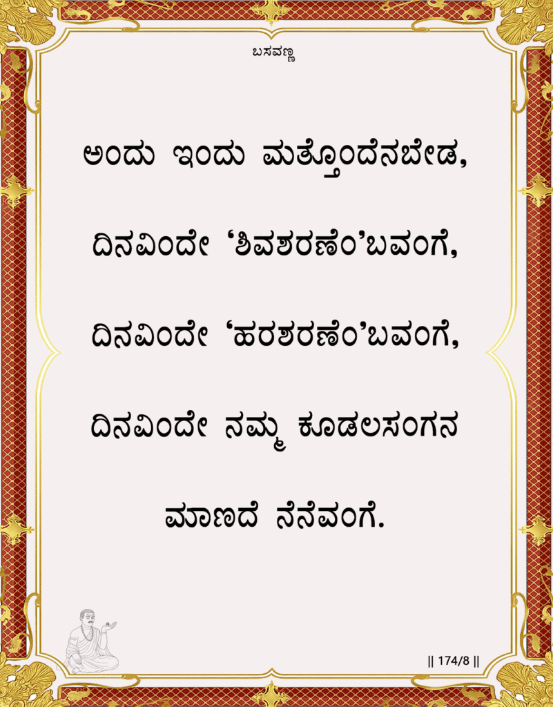 The poet commands to stop speaking of yesterday or tomorrow. He resolves to live each day, in the present moment, as a “Sharana of Shiva” and a “Sharana of Hara,” remembering his Lord Kudalasangama continually and without fail.