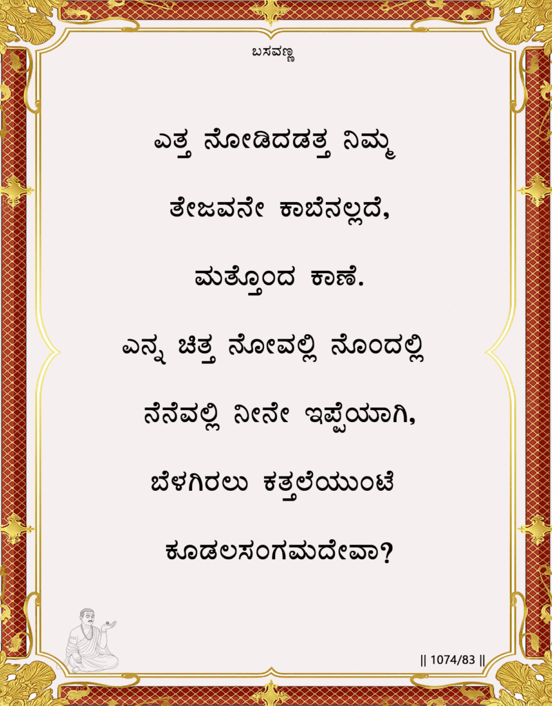 In this vachana, Basavanna describes the highest state of perception where the divine presence fills every corner of experience. Just as darkness disappears when the sun rises, all dualities joy and sorrow, thought and emotion lose their separate identity in the brilliance of God awareness. This is not a poetic exaggeration but a statement of spiritual physics: when true perception dawns, everything resolves into the single radiance of the Divine. The seeker no longer “finds” God God becomes the very medium through which all life is seen.