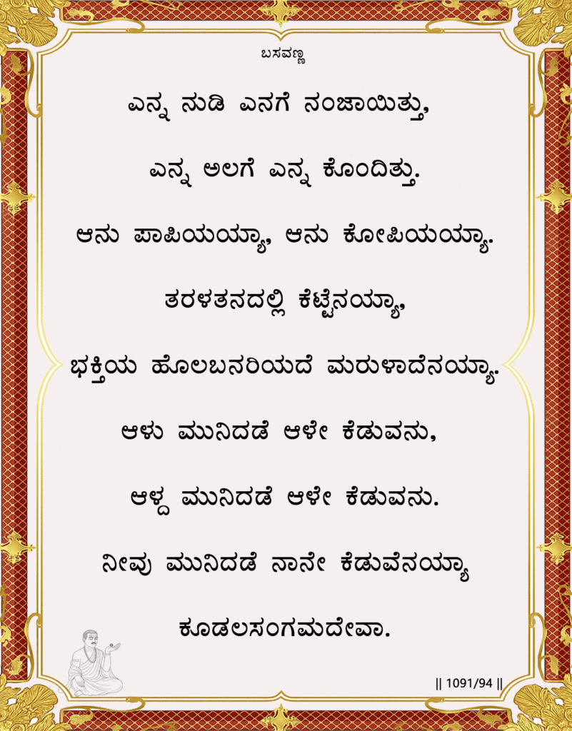 In this vachana, Basavanna confesses that his downfall arises not from others but from his own speech, impulses, and immaturity. He recognizes that without understanding the way of devotion, he has repeatedly harmed himself through anger and ignorance. Yet he also affirms a profound truth: when humans falter, only divine compassion can save them. If the Lord were to withdraw even slightly, the loss would be entirely his. Thus he stands before Koodalasangamadeva, seeking not justice but mercy, knowing that the devotee depends wholly on divine grace for transformation.